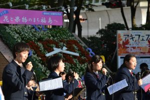 メイン会場のこむこむでは、吹奏楽、ハンドベル、理科研究などの部活動発表や、看護、レゴロボ教室、自然科学などの公開授業、各私学のパネル展示と個別相談ブースが設けられ、大勢の方にご来場いただきました。また、サブ会場の福島駅前広場では、書道、ダンス、吹奏楽、合唱の部活動発表が行われ、椅子席を取り巻くように大勢の立ち見の方が生じるなど、例年と比べて大賑わいで活気溢れた発表となり、発表した生徒達の表情は温かい拍手に包まれ充実感に溢れていました。本校といたしましても今後も私学の魅力を発信し続け、私学の良さを多くの方々にお伝えし理解を深めていただけますように努力してまいります。