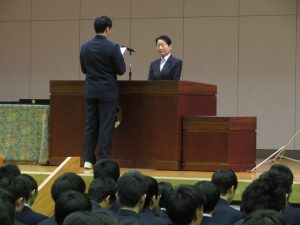 2月28日㈬、同窓会入会式が行われ、明日の卒業式を前にした高校3年生312名が石井都会長より同窓会への入会を許可されました。卒業生代表の佐藤昴さんが代表で宣誓を行った後、各クラスごとに幹事が委嘱され、今後の同窓会活動を推進する役割が託されました。