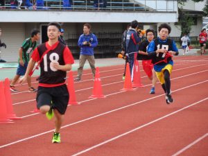 10月18日(水)秋晴れの下、信夫ヶ丘陸上競技場にて校内競技大会が開催されました。この競技大会は高等学校の運動会的な行事で、短距離走(100m・200mなど)や走り幅跳びなどの個人種目や、リレー(男子・女子・混合)やミニ駅伝等をはじめ、3人4脚、キャタピラリレー、集団縄跳び等の団体種目をクラス対抗戦で行う球技大会同様にクラスの絆を深める、とても盛り上がる学校行事の1つです。例年、エントリーする競技の選択を工夫したり、競技種目について作戦を立てたりと各クラスで趣向を凝らしながら、上位を目指そうとする様子が見られます。クラスメイトを応援する黄色い歓声が秋空に響き渡り、その声援を受けて一生懸命に競技する生徒たちの様子は、まさに『青春の1ページ』に相応しく、運動の秋を象徴するような爽やかな一日となりました。