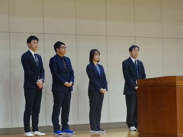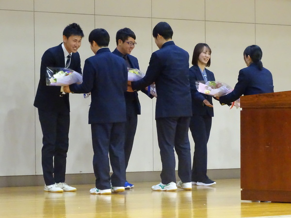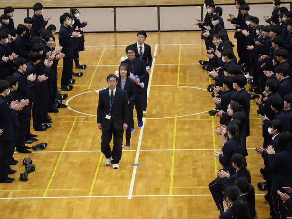 続いて行われた離任式では、今年度で本校を離れる先生の紹介があり、お一人ずつ挨拶をいただきました。勤務年数は様々ですが、どの先生も、生徒たちに愛情をもって接してくださっていたことが伝わってくるお話しでした。この先生方も4月からは新しい環境での生活が始まります。幸あれと祈念いたします。