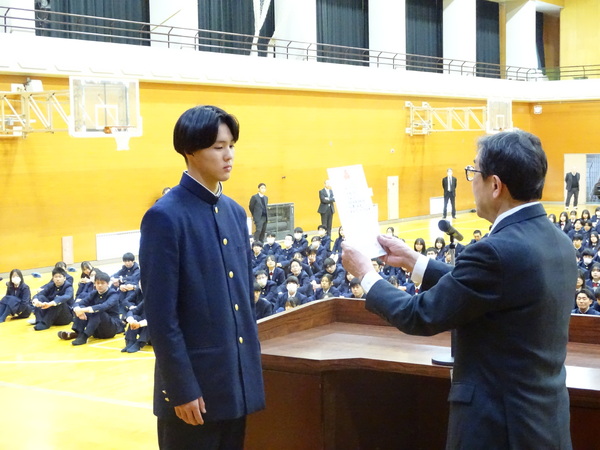 校長先生のお話の後、3学期にあった大会、コンクール、検定等の表彰が行われました。また、生活担当の先生からは春季休業中も高校生としての自覚を持った生活をするよう、お話がありました。