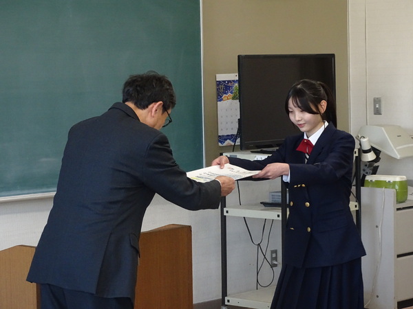 3学期の始業式をリモートで行いました。校長先生のお話の後、表彰状、認定証が代表生徒に渡されました。