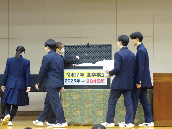 また、同窓会入会式に先立って、タイムカプセルに各クラスの「想い出」が入れられました。20年後、彼らが38歳になった年に向けて静かに眠りにつきます。