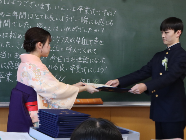 卒業生一人ひとりの氏名を担任が呼名し、校長より卒業が認定され、代表生徒に卒業証書が渡されました。